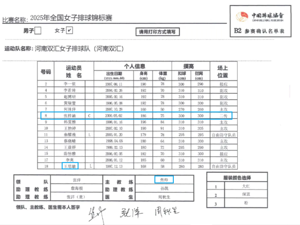 河南女排名单情况如下【主攻6人】何沐洋,韩雯雅,王怡婷,蔡晓晴,王益群,李爽【副攻3人】李若琦,赵博研,黄瑞蕾【接应2人】李一依,陈怡雅【二传1人】张梓涵【自由人2人】秦耀薇,王思敏